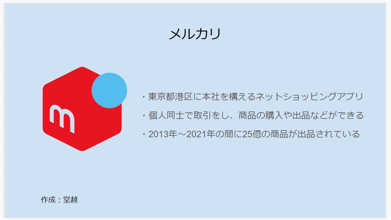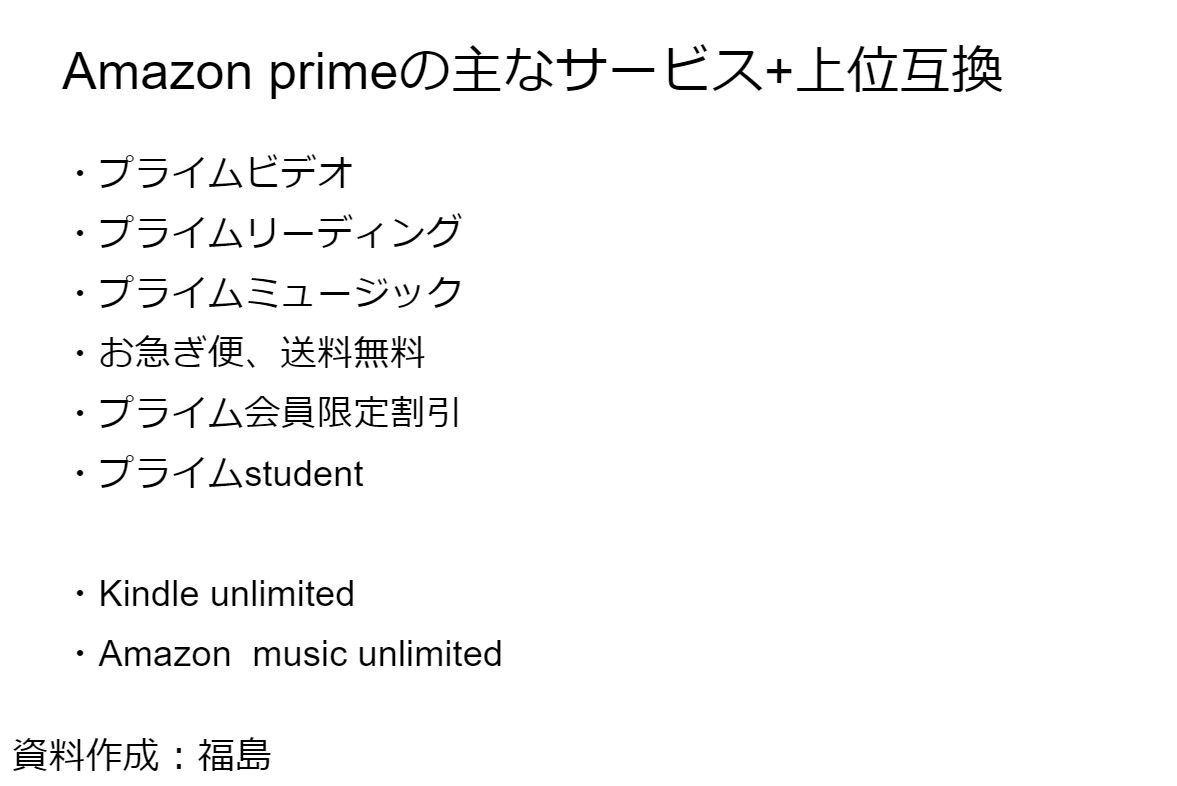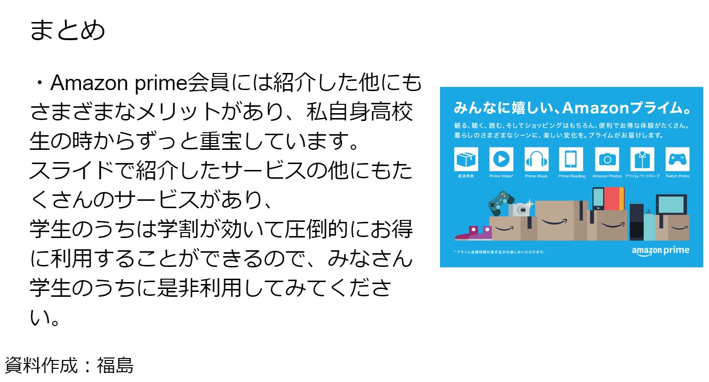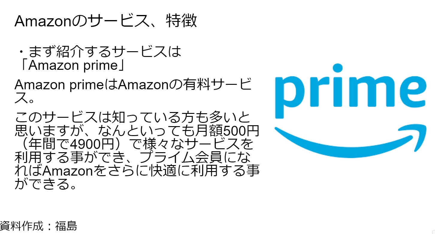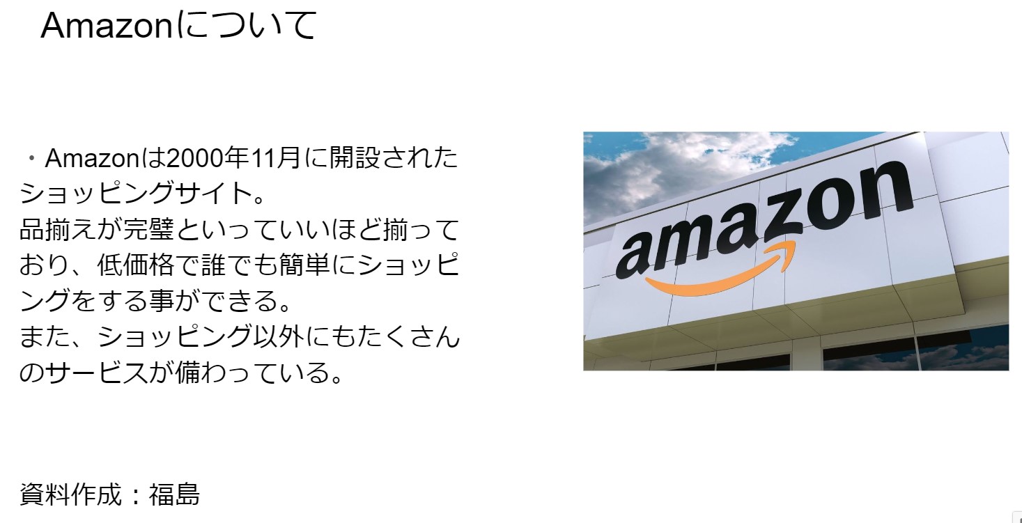 ECサイト、主にAmazonについて紹介しました。Amazonプライムの特典、その中でもAmazonfreshに重点をおいて資料を作成しました。また、Yahooショッピングともひかくをし、その結果をまとめて発表をしました。