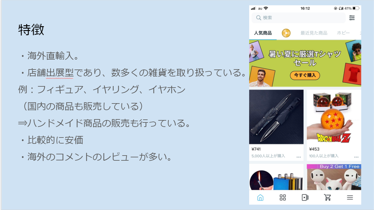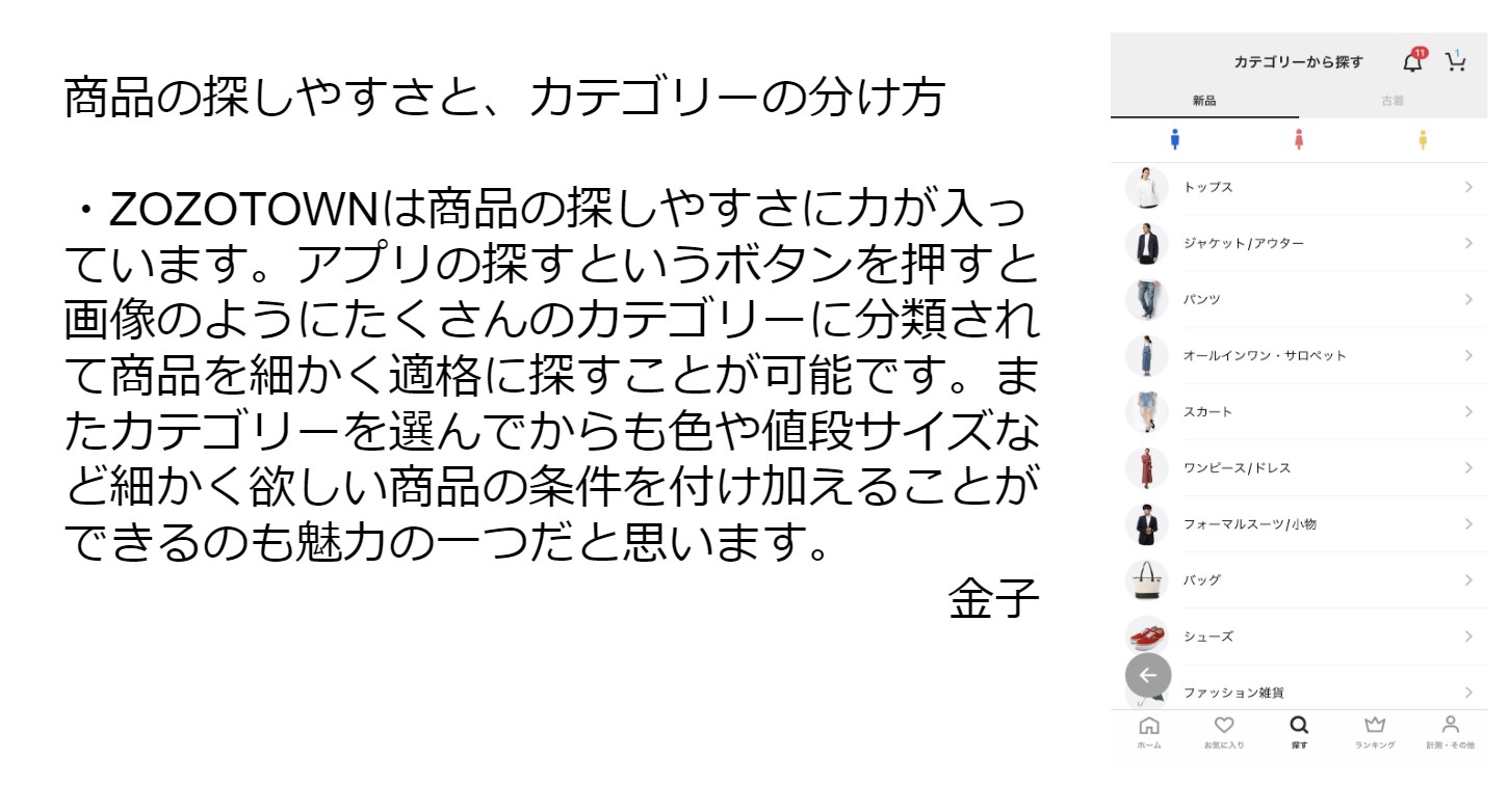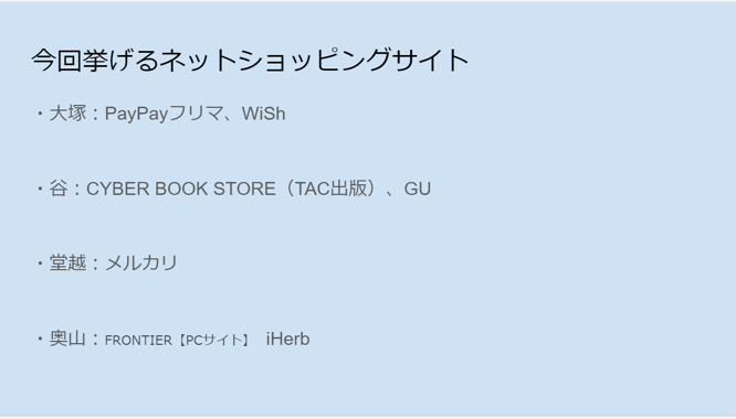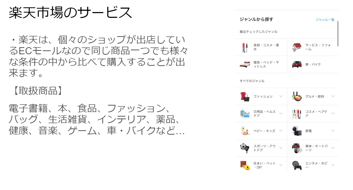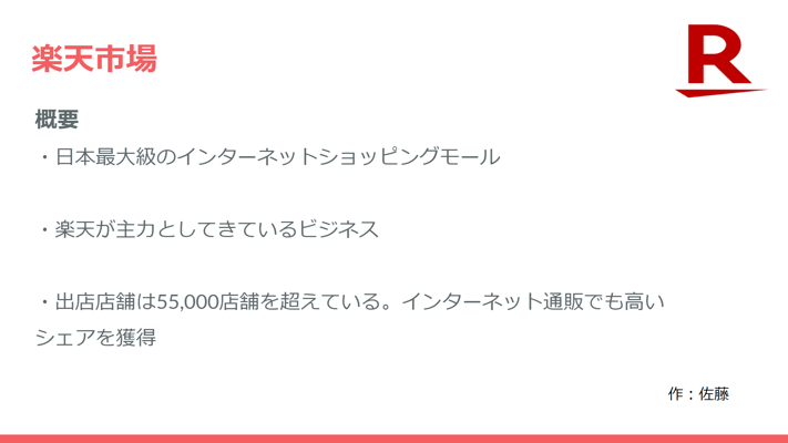 ここでは楽天市場について紹介をしました。ポイントでのお得な買い物方法や、購入した際の包装や配達時間などのレビューなど使い手の目線で発表することを意識しました。
