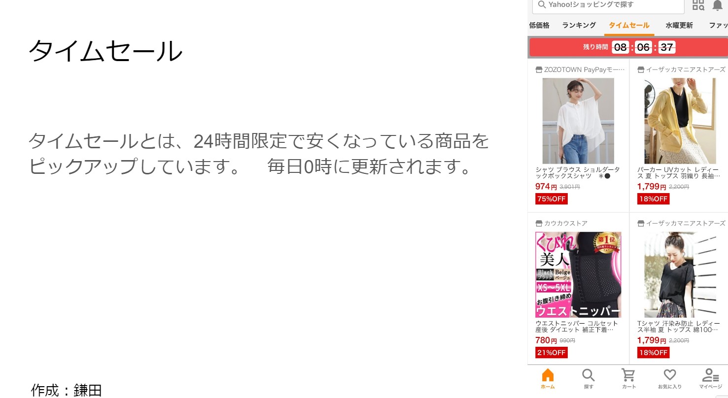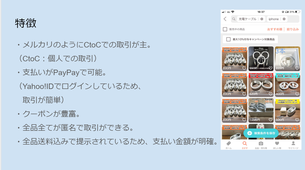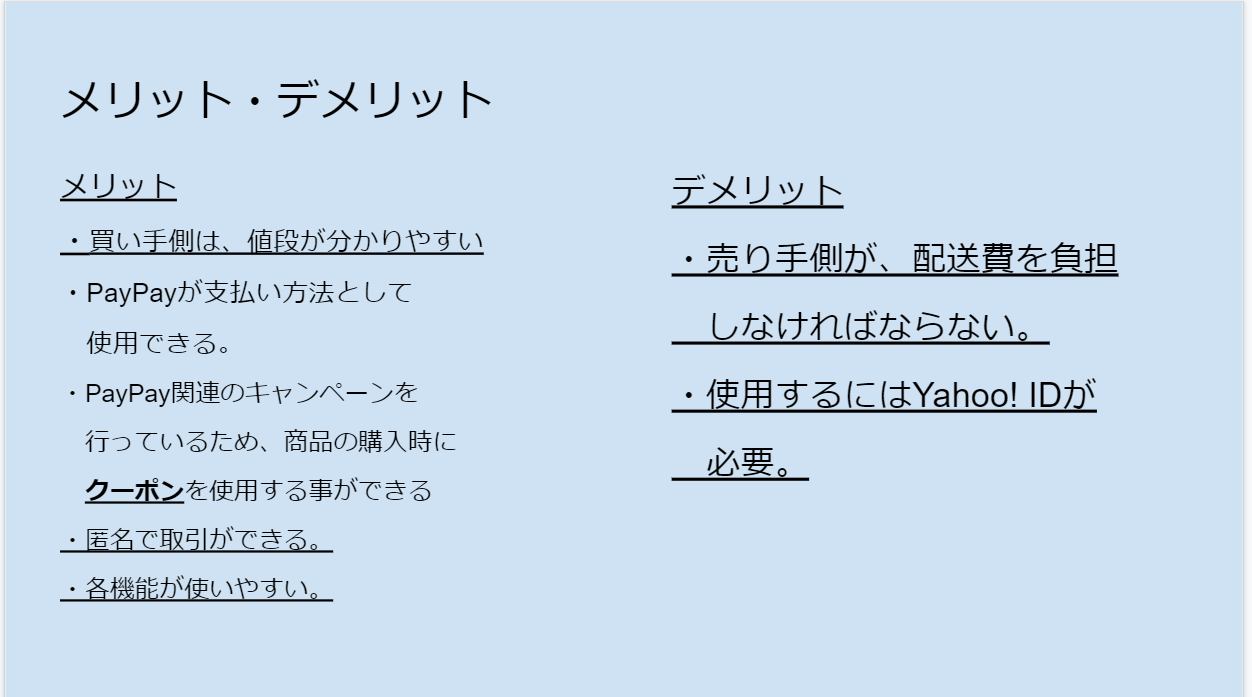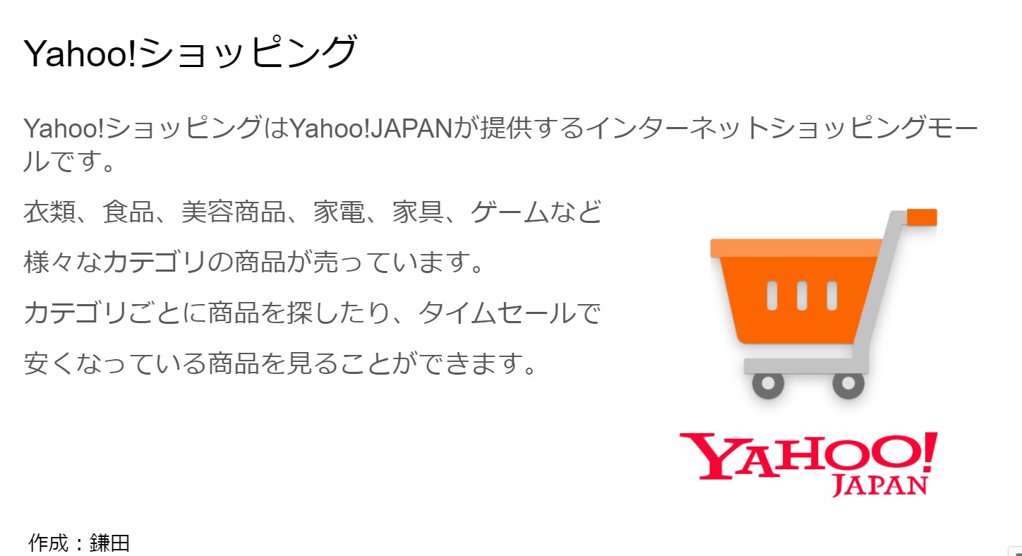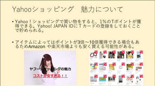 次に、Yahooショッピングについて紹介を行いました。ここでは、アマゾン同様にYahooショッピングの概要について紹介した後に、過去購入した商品の紹介を行いました。その中で、Yahooショッピングの魅力や特徴について触れて発表しました。