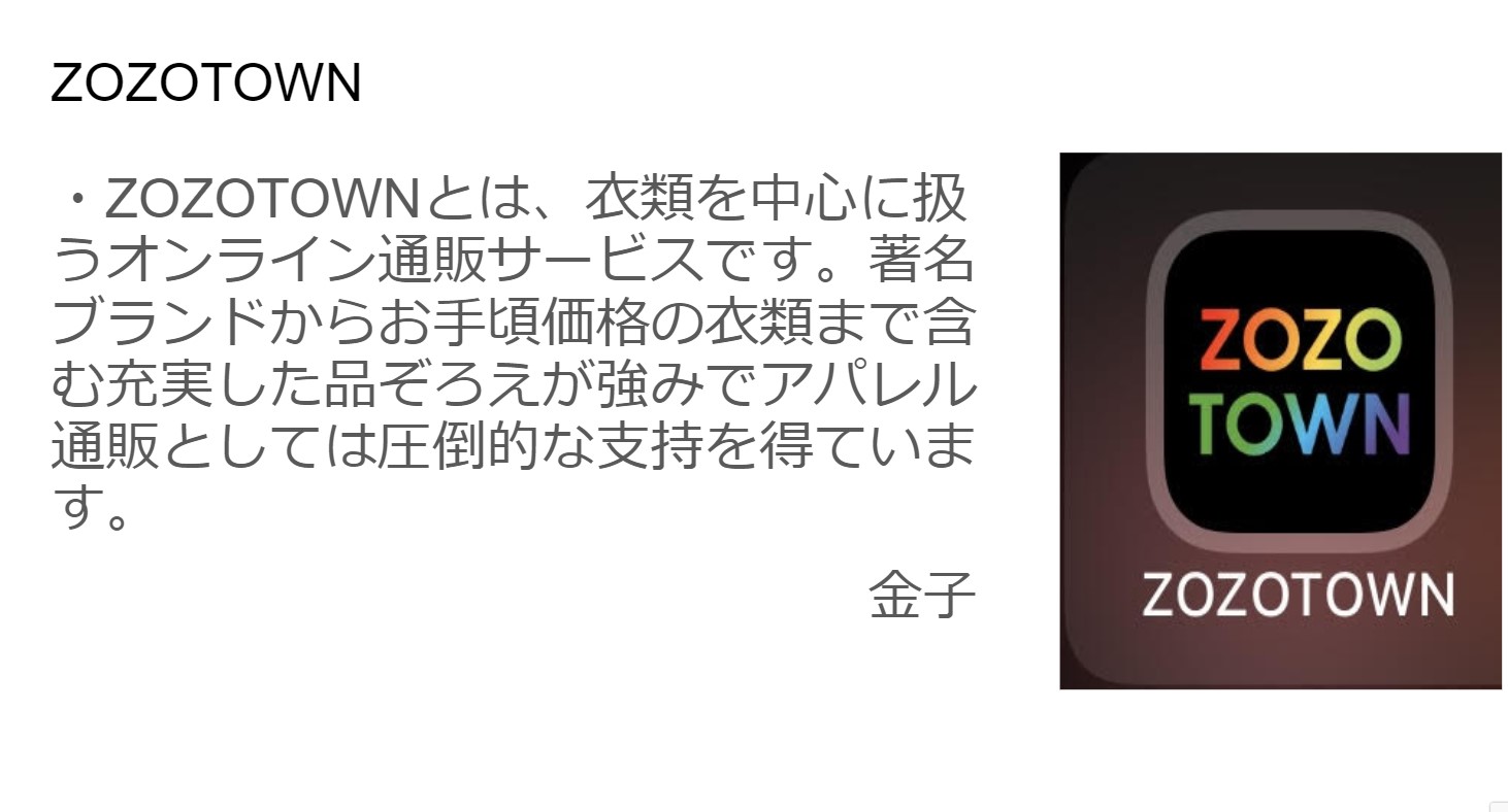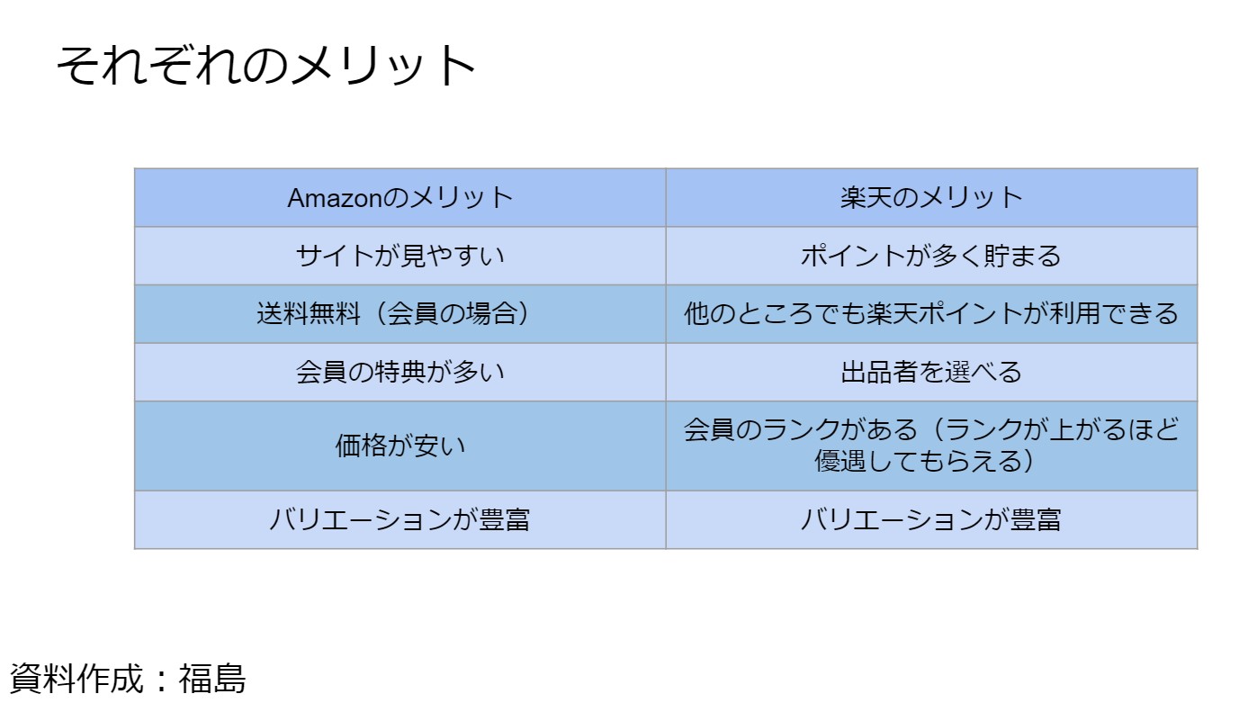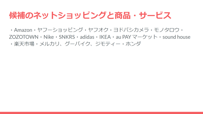 このように、各ECサイトの要点やメリットをスライドと共に発表を行いました。
