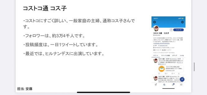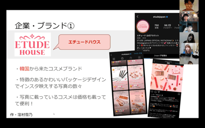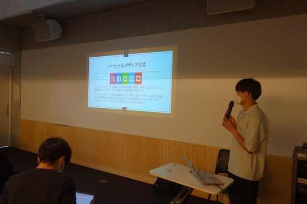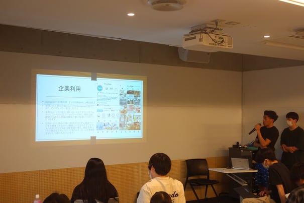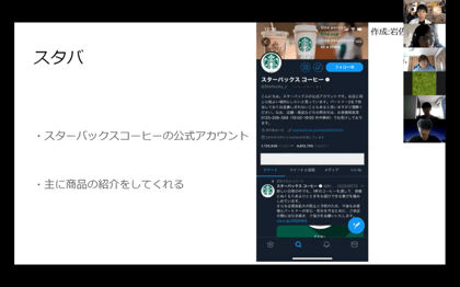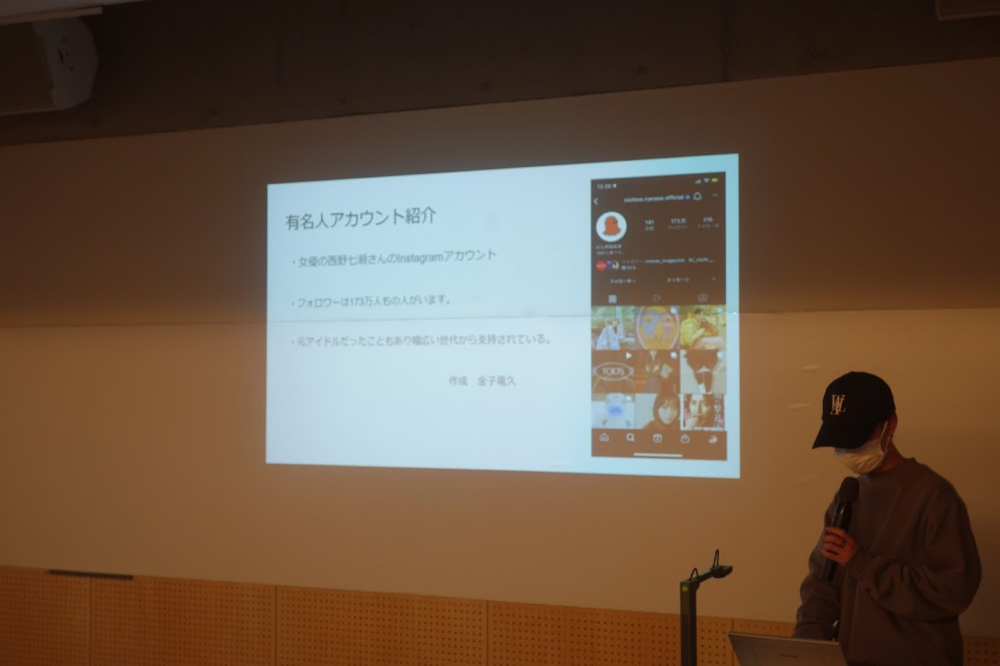 Twitter,instagram同様に概要について説明した後に、企業のアカウント紹介と個人のアカウント紹介を行いました。