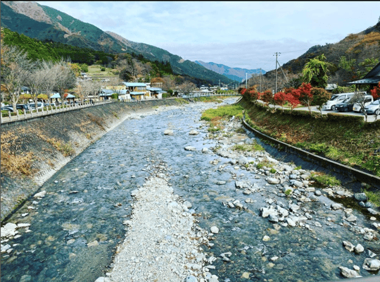 川沿いに出たら、横浜天然温泉を右手側にまっすぐ進みます。