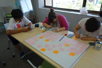 スマホのSNSアプリを使って、鶴見の魅力について発信している投稿などをメモ用紙に書きだしました。これをもとに自分たちで鶴見のいいところを発信する計画を立てました。