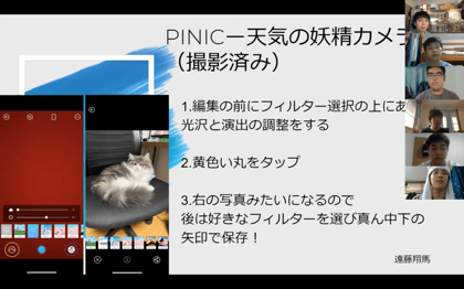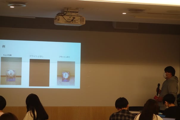 HujiCamというカメラアプリを紹介しカメラアプリを紹介しました。アプリの説明と実習時間を通しHujiCamの魅力やレトロ写真を深めていただきました。アプリだけでは魅力が伝わらないと思いレトロ写真を撮れる商品との比較もしました。
