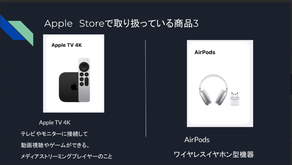 内容としてはApple社について軽く発表をし、そこからはiPhoneの進化や最新機種の新機能、今まで使ってきたiPhone同士の比較などについて説明を行った。