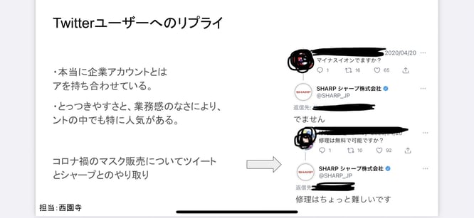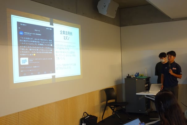 Twitterの良い点や使いやすい点を元に説明を行い、実際の企業の活用例としてここでは「ミズノ」様の公式Twiterの紹介を行いました。